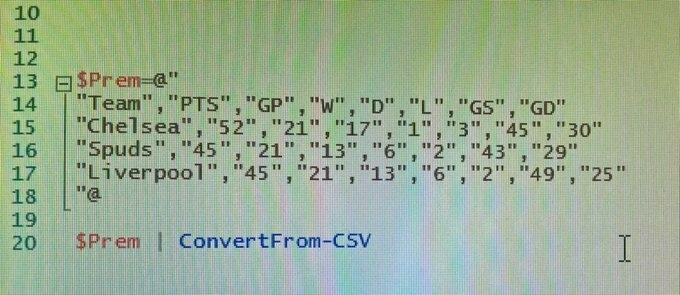 #TodayILearned that you can set a CSV in a here-string and turn it into an object. Handy for small test datasets in @PSPester #PowerShell