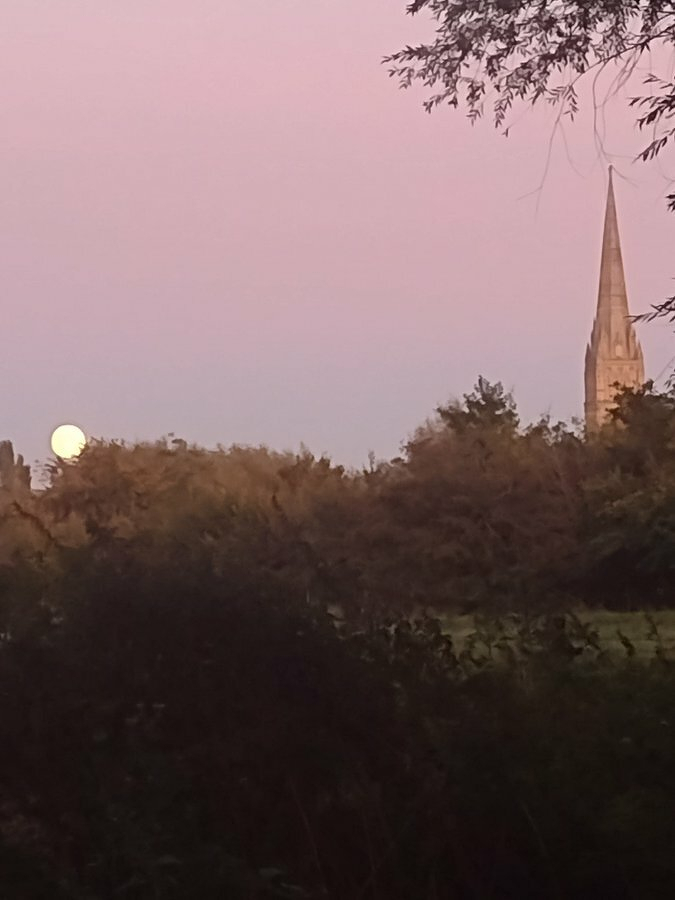 Just jogged by the river behind Churchfields and there was a chap with a huuuuuge camera, and at a better angle, taking a pic of @SalisburyCath and the full moon rising